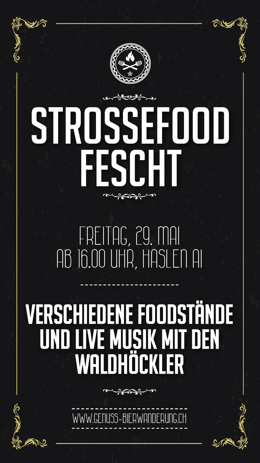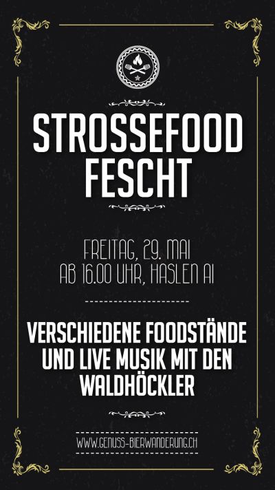 Das Genusswochenende beginnt dieses Jahr am Freitag, 29. Mai. Wir empfangen euch ab 16.00 Uhr zum Strossefood Fescht mit verschiedenen Foodständen. Bekannt sind sie bereits bei vielen Leuten, die "Street-Food Festivals". Nun findet eine Miniatur-Variante auch in Appenzell Innerrhoden statt. Kulinarische Leckerbissen warten auf dem Festgelände in Haslen darauf von euch verspeist zu werden.