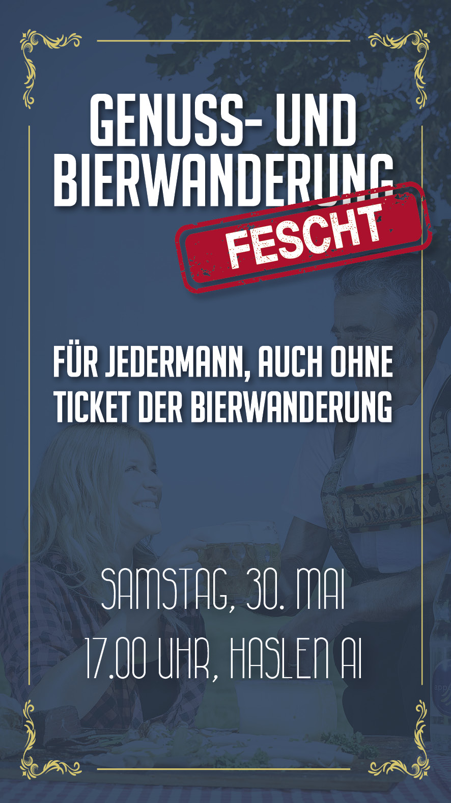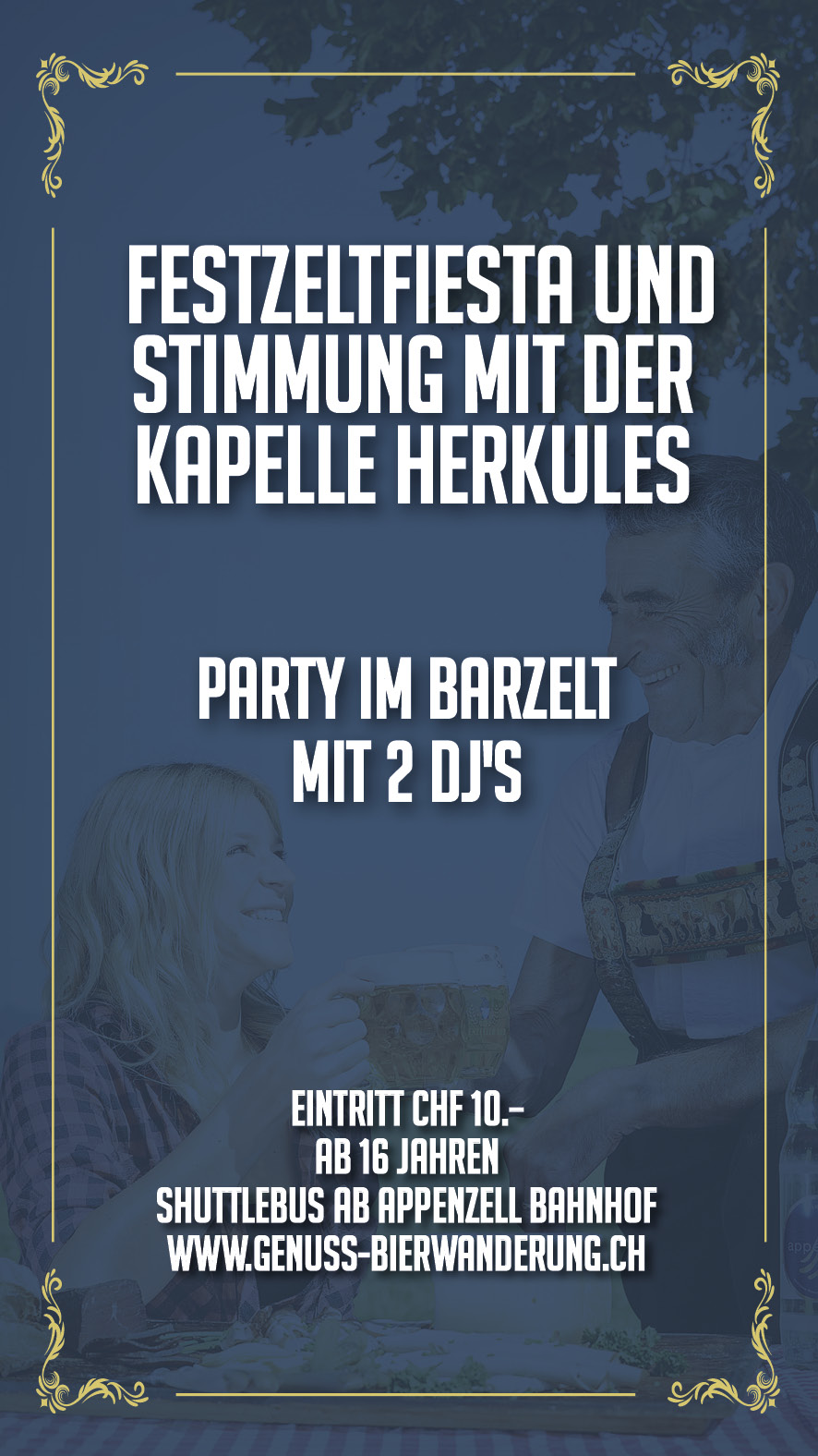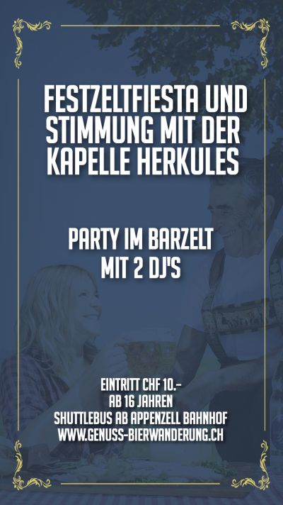 Leider kein Ticket der Genuss- und Bierwanderung ergattert? Kein Problem, der Eintritt zum "Gnoss- ond Bierfest" ist für jedermann. Ab 17.00 Uhr erwartet dich im Dorf Haslen eine Partymeile mit Fest- und Barzelt. Livemusik mit der Kapelle Herkules und Barzelt mit zwei DJ's. Es fährt ein Shuttlebus ab Appenzell Bahnhof. Eintritt CHF 10.– und ab 16 Jahren (Ausweiskontrolle).